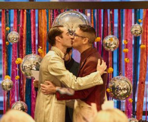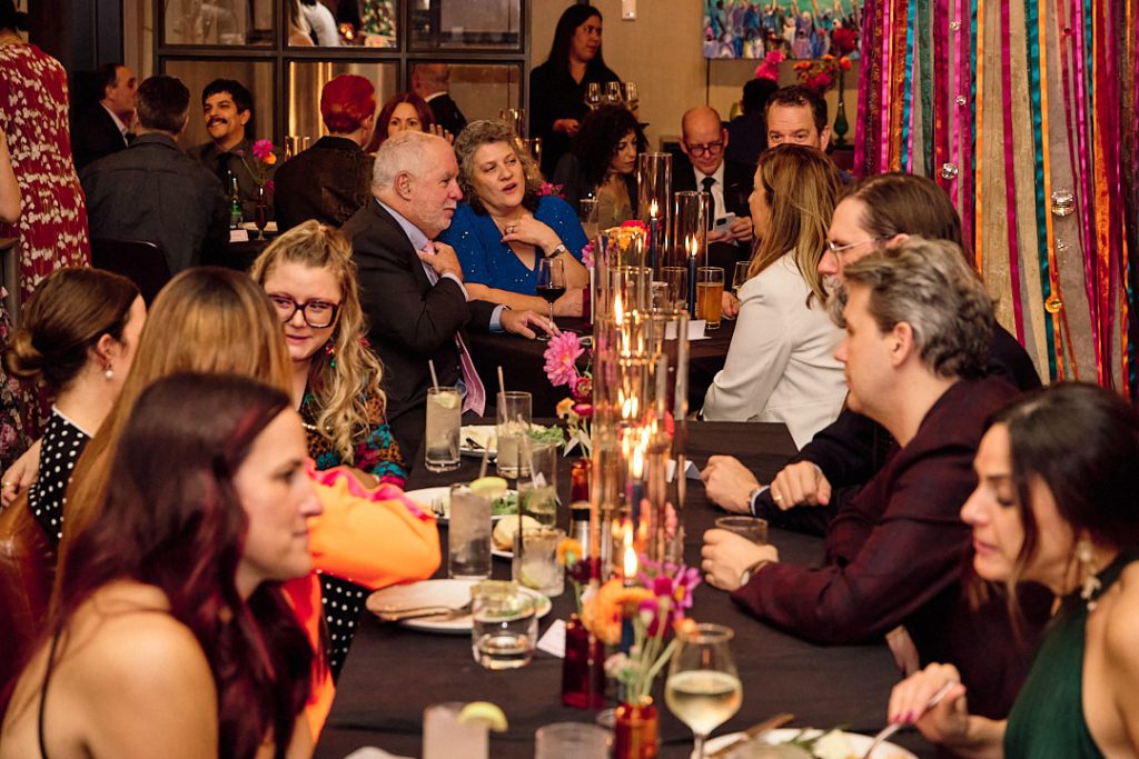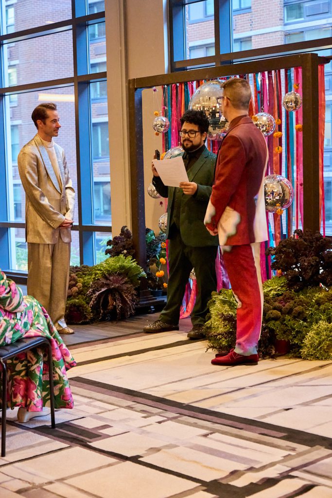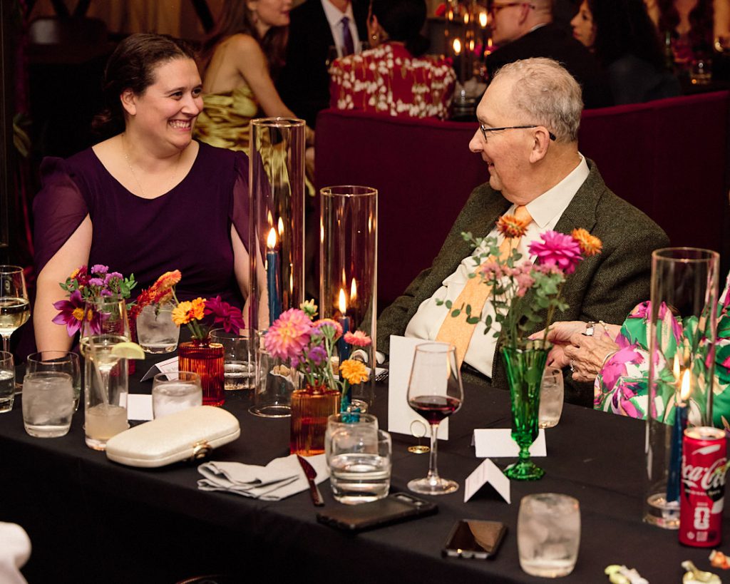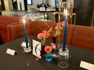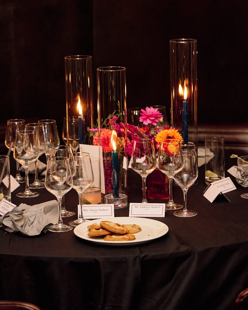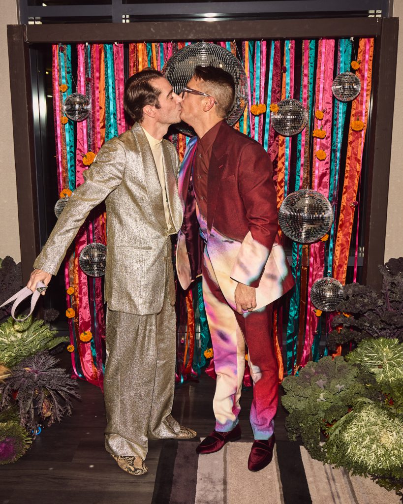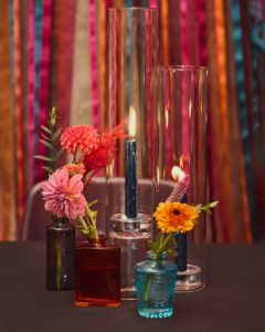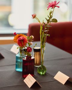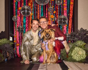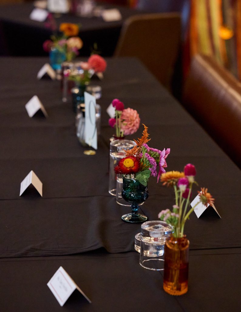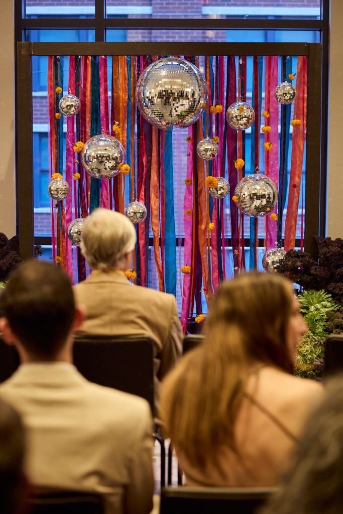 The combination of rich jewel tones and disco balls really transformed this hotel conference room and restaurant into an oasis! Eclectic vessels, beautiful dahlias, all the ribbon, hundreds of candles, disco balls, and a literal van full of ornamental kale made the space come alive and become the perfect backdrop to celebrate the love of two amazing people, and their dog Paloma.